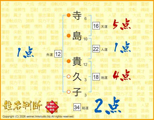 寺(6画)島(10画) 貴(12画)久(3画)子(3画)