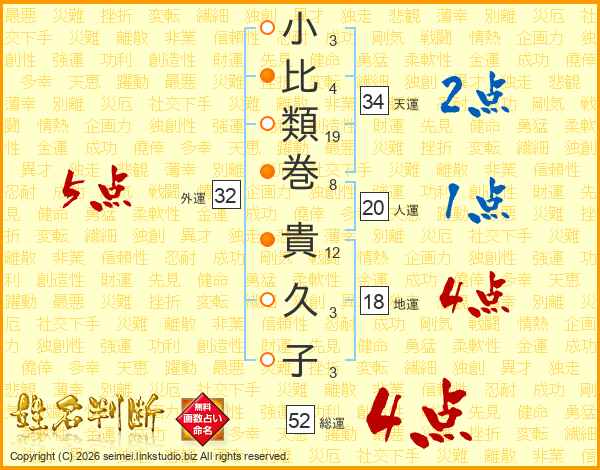 小(3画)比(4画)類(19画)巻(8画) 貴(12画)久(3画)子(3画)