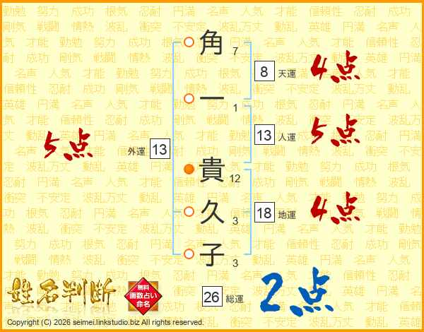 角一貴久子さんの人運は13画の5点!