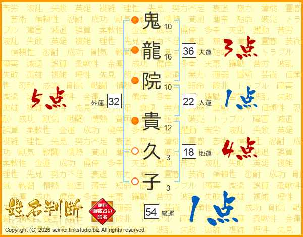 鬼(10画)龍(16画)院(10画) 貴(12画)久(3画)子(3画)