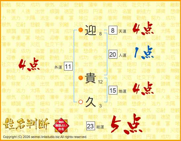 迎(8画) 貴(12画)久(3画)
