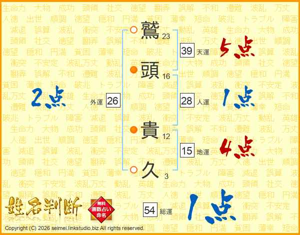 鷲(23画)頭(16画) 貴(12画)久(3画)