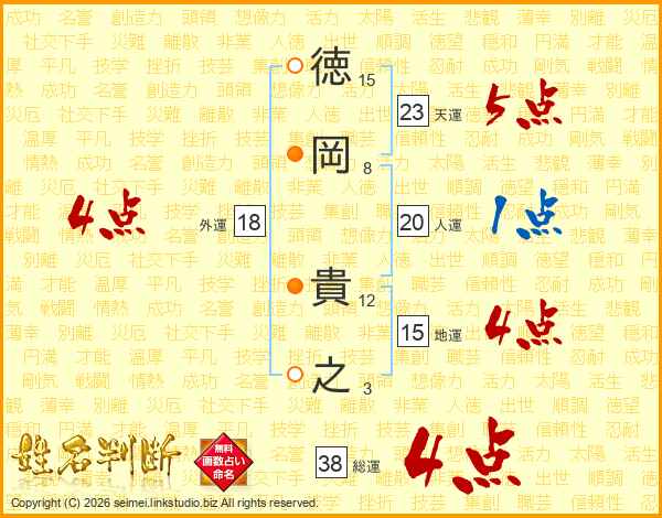徳(15画)岡(8画) 貴(12画)之(3画)