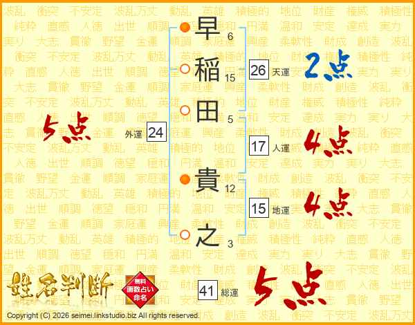 早稲田貴之さんの総運は41画の5点!