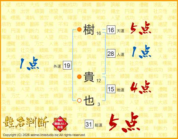 樹貴也さんの総運は31画の5点!