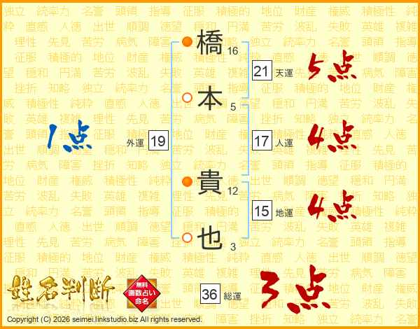 橋(16画)本(5画) 貴(12画)也(3画)