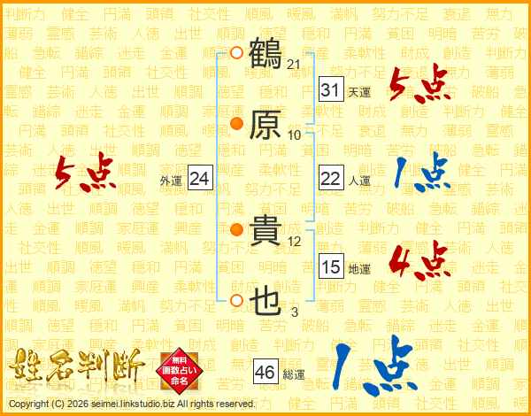 鶴原貴也さんの総運は46画の1点!