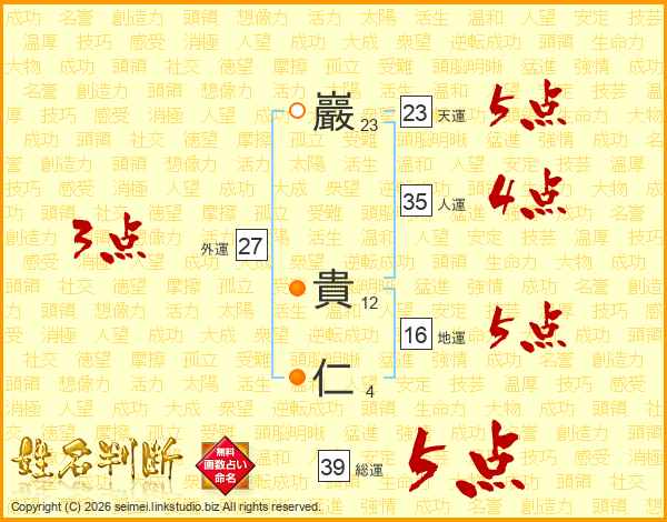 あなたの人生を表す1番重要な運勢です。生涯を通じて影響する総合運となり、主に50歳以降の晩年期に影響を及ぼします。苗字と名前の合計画数。