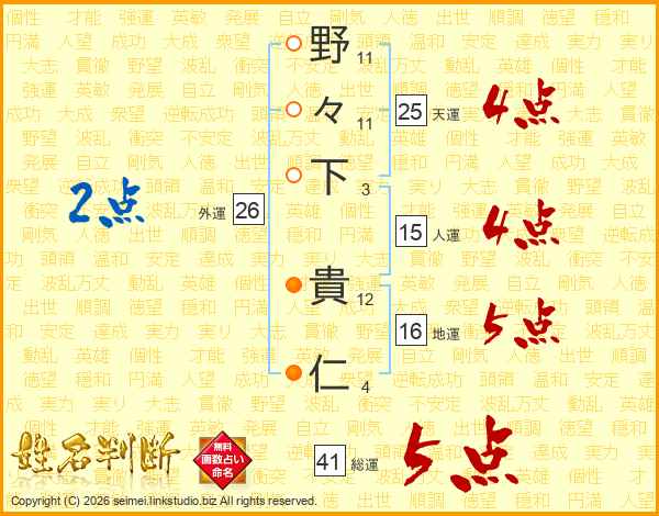野(11画)々(11画)下(3画) 貴(12画)仁(4画)
