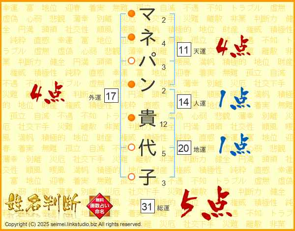 生活面を象徴する運勢です。外部から受ける影響力を表し、結婚運、家庭運や職場、環境への順応性を表します。総運から人運を引いた画数。姓や名が1文字の場合を除く。