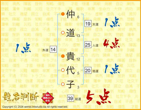 仲(6画)道(13画) 貴(12画)代(5画)子(3画)