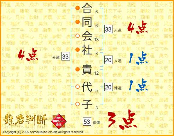 合同会社貴代子さんの外運は33画の4点!