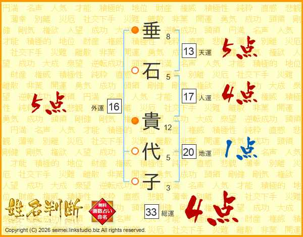 垂石貴代子さんの総運は33画の4点!