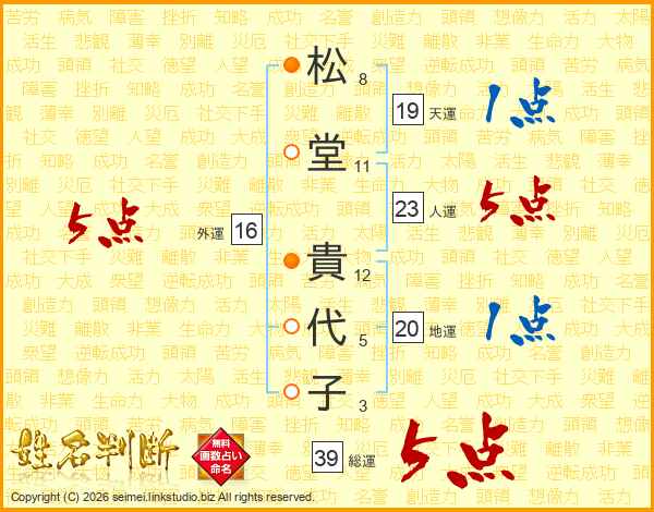松(8画)堂(11画) 貴(12画)代(5画)子(3画)