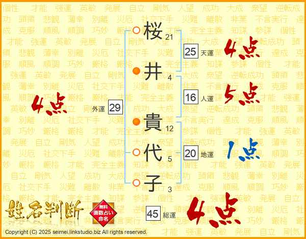 桜(21画)井(4画) 貴(12画)代(5画)子(3画)