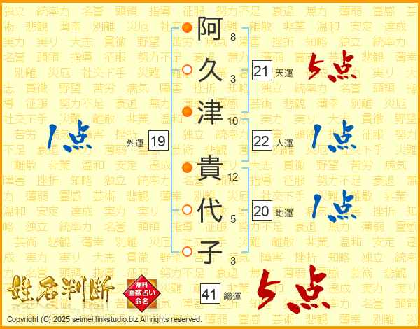 阿(8画)久(3画)津(10画) 貴(12画)代(5画)子(3画)