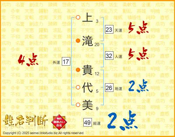 上(3画)滝(20画) 貴(12画)代(5画)美(9画)