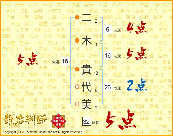 二(2画)木(4画) 貴(12画)代(5画)美(9画)