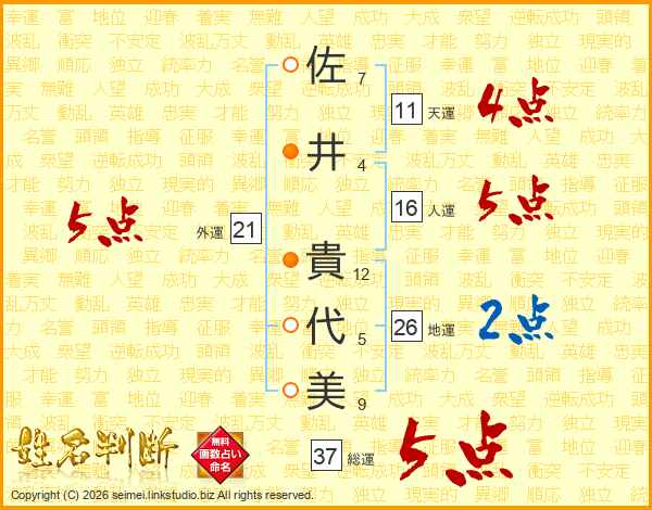 佐井貴代美さんの総運は37画の5点!