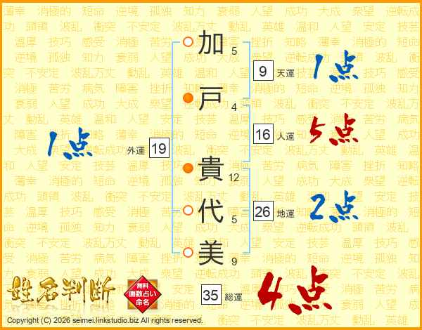 加(5画)戸(4画) 貴(12画)代(5画)美(9画)