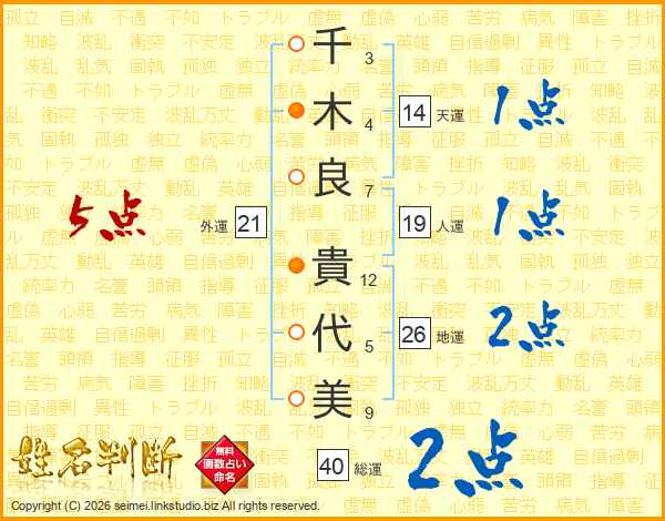 千(3画)木(4画)良(7画) 貴(12画)代(5画)美(9画)