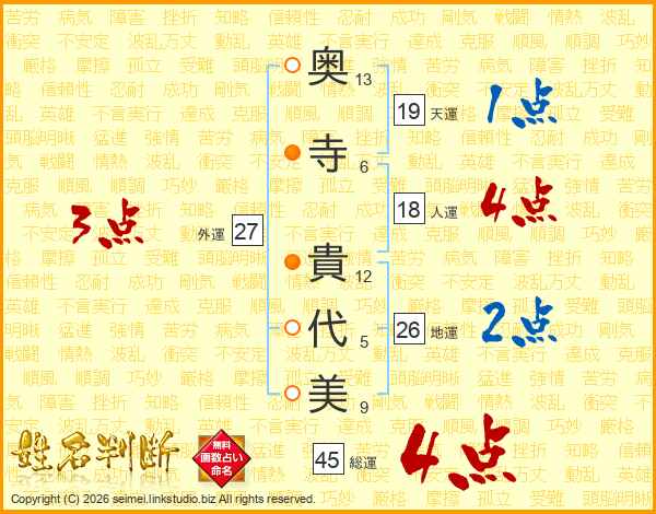 奥(13画)寺(6画) 貴(12画)代(5画)美(9画)