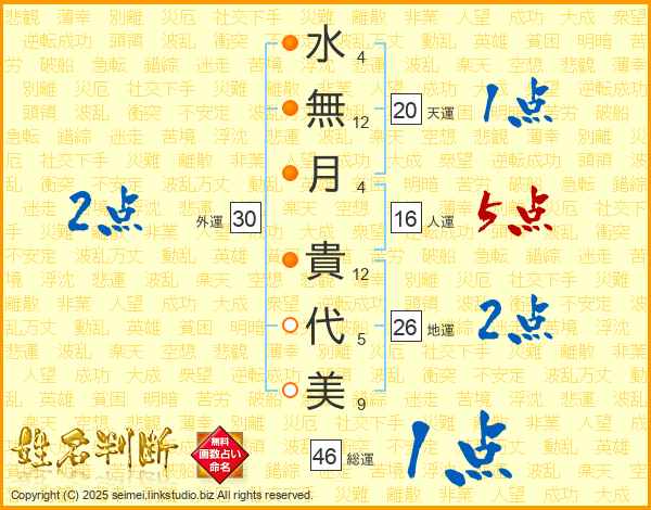 水(4画)無(12画)月(4画) 貴(12画)代(5画)美(9画)