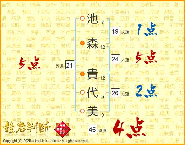 池(7画)森(12画) 貴(12画)代(5画)美(9画)