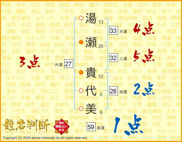 湯(13画)瀬(20画) 貴(12画)代(5画)美(9画)