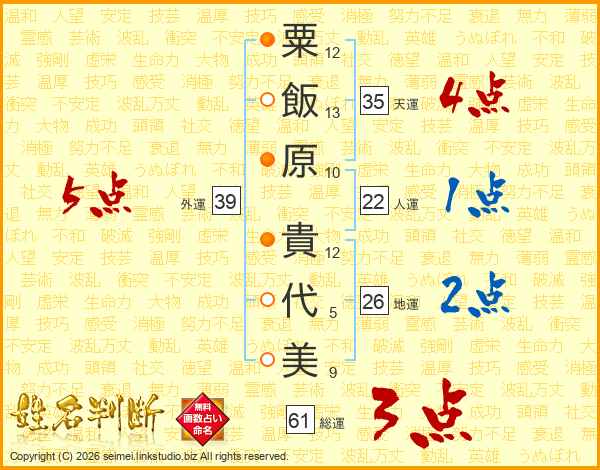 粟(12画)飯(13画)原(10画) 貴(12画)代(5画)美(9画)