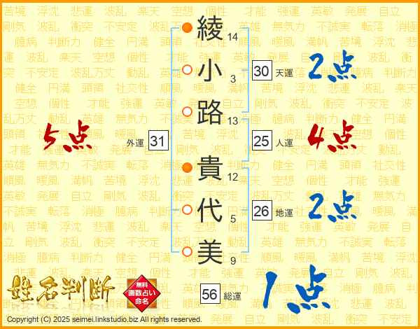 綾(14画)小(3画)路(13画) 貴(12画)代(5画)美(9画)