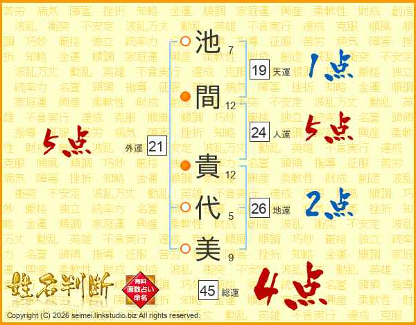 池(7画)間(12画) 貴(12画)代(5画)美(9画)