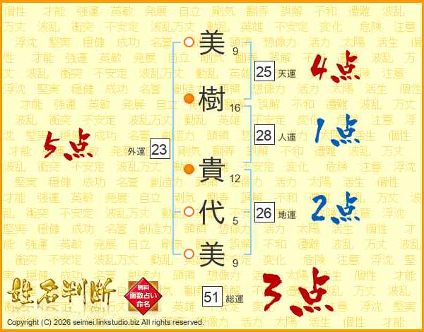 美(9画)樹(16画) 貴(12画)代(5画)美(9画)
