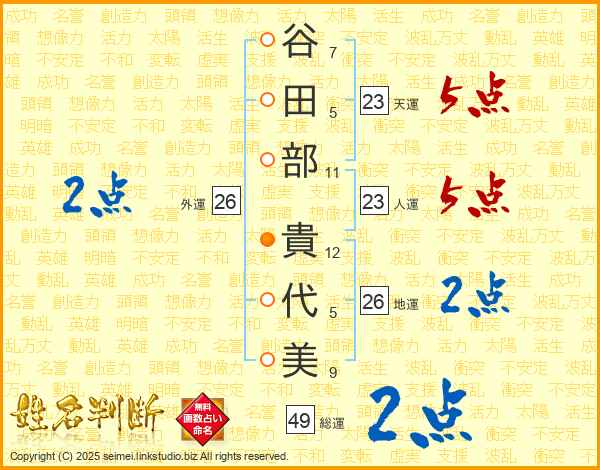谷(7画)田(5画)部(11画) 貴(12画)代(5画)美(9画)