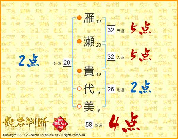 雁(12画)瀬(20画) 貴(12画)代(5画)美(9画)