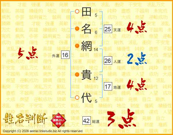 田(5画)名(6画)網(14画) 貴(12画)代(5画)