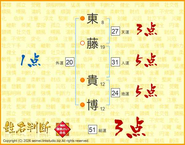あなたの人生を表す1番重要な運勢です。生涯を通じて影響する総合運となり、主に50歳以降の晩年期に影響を及ぼします。苗字と名前の合計画数。
