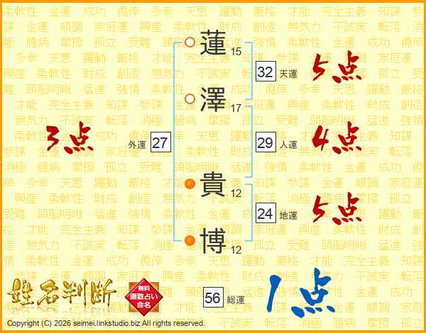 蓮(15画)澤(17画) 貴(12画)博(12画)