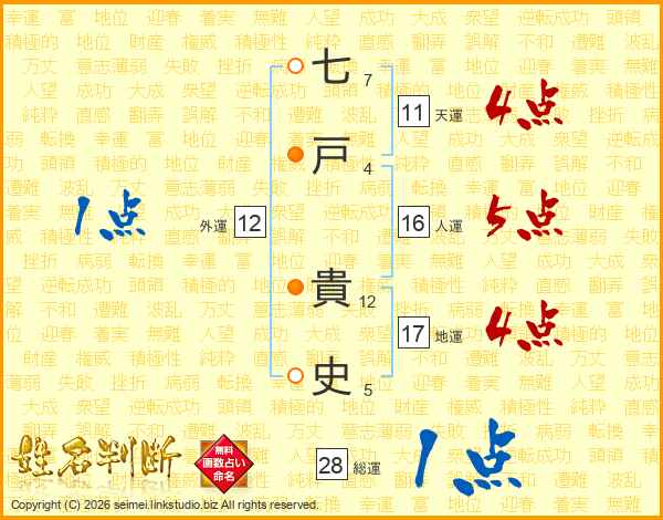 あなたの人生を表す1番重要な運勢です。生涯を通じて影響する総合運となり、主に50歳以降の晩年期に影響を及ぼします。苗字と名前の合計画数。