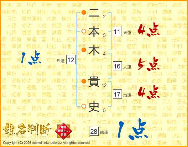 二(2画)本(5画)木(4画) 貴(12画)史(5画)