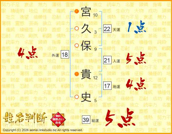 宮(10画)久(3画)保(9画) 貴(12画)史(5画)