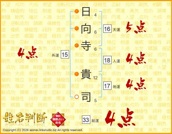 日(4画)向(6画)寺(6画) 貴(12画)司(5画)