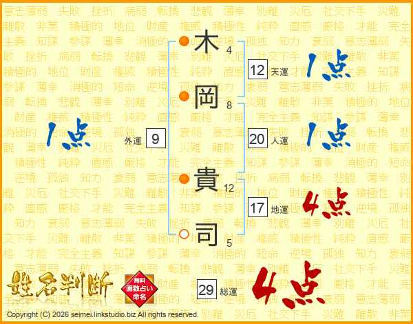 木(4画)岡(8画) 貴(12画)司(5画)