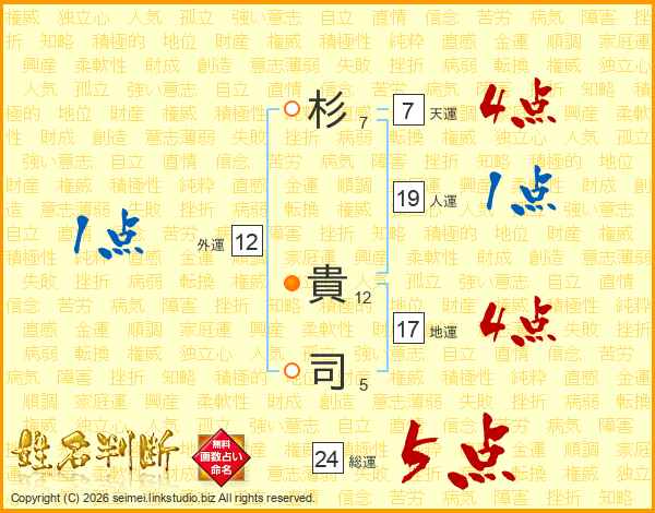 生活面を象徴する運勢です。外部から受ける影響力を表し、結婚運、家庭運や職場、環境への順応性を表します。総運から人運を引いた画数。姓や名が1文字の場合を除く。