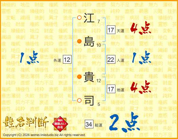 生活面を象徴する運勢です。外部から受ける影響力を表し、結婚運、家庭運や職場、環境への順応性を表します。総運から人運を引いた画数。姓や名が1文字の場合を除く。