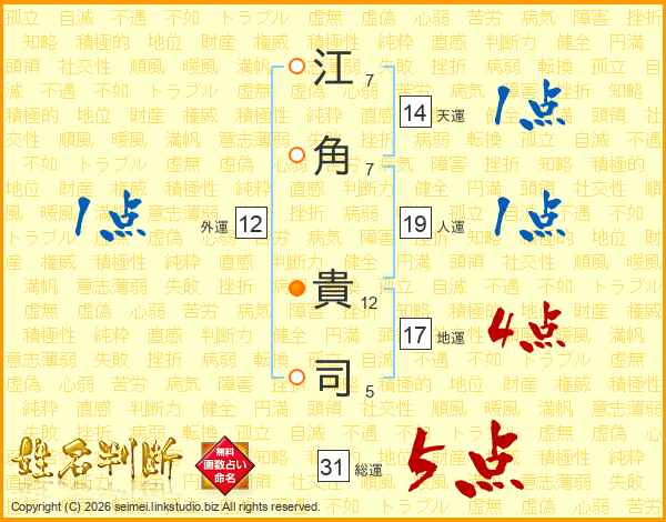 江(7画)角(7画) 貴(12画)司(5画)