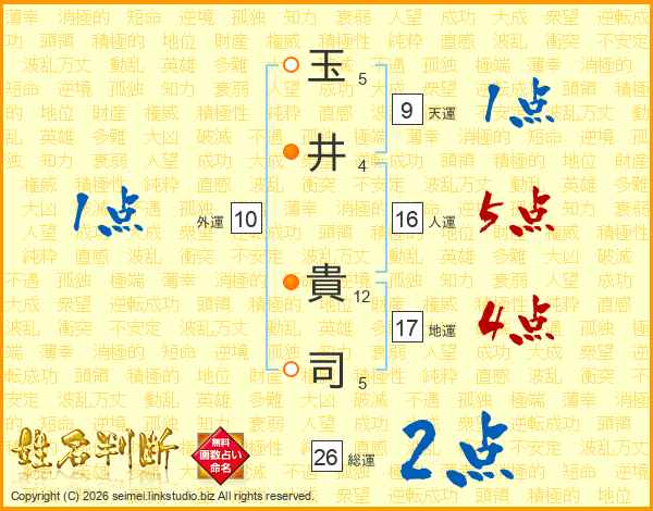 あなたの人生を表す1番重要な運勢です。生涯を通じて影響する総合運となり、主に50歳以降の晩年期に影響を及ぼします。苗字と名前の合計画数。