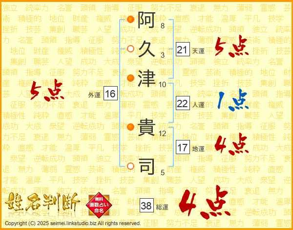 阿(8画)久(3画)津(10画) 貴(12画)司(5画)