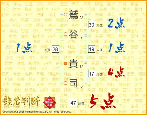鷲(23画)谷(7画) 貴(12画)司(5画)