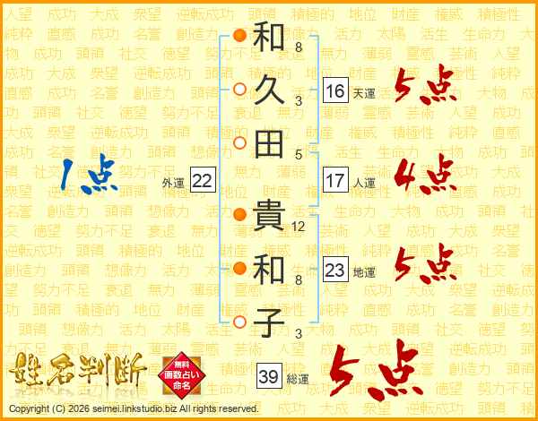 和(8画)久(3画)田(5画) 貴(12画)和(8画)子(3画)